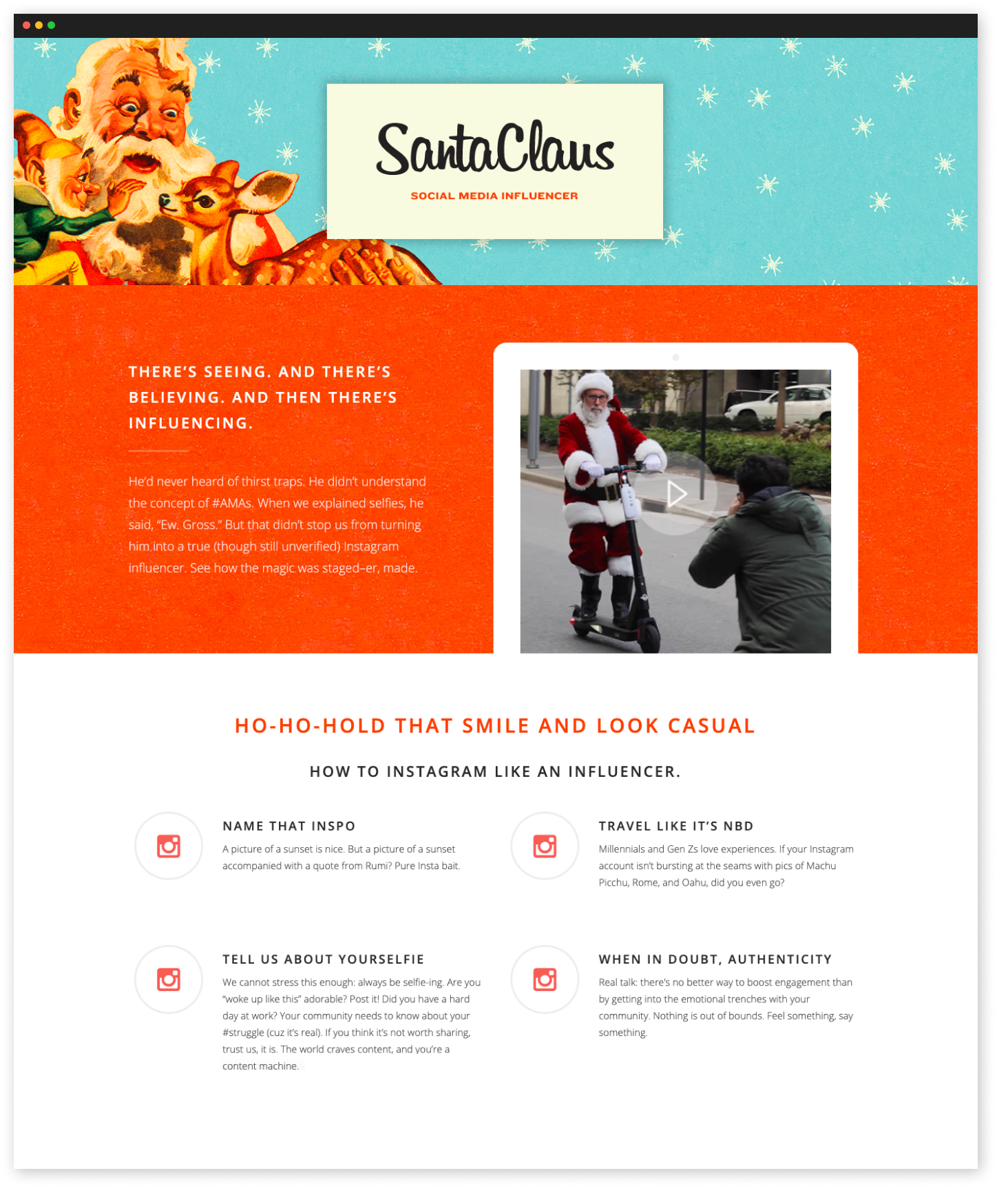 Santa as a social media influencer. Initially reluctant, he got the hang of things pretty quickly. The site won some ADDYs, and the Instagram account won some fans.