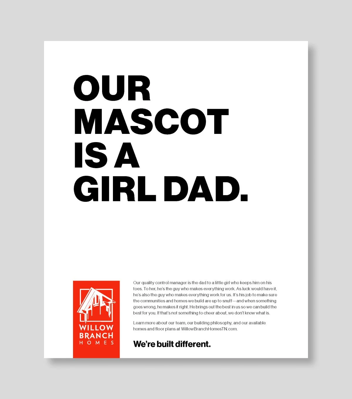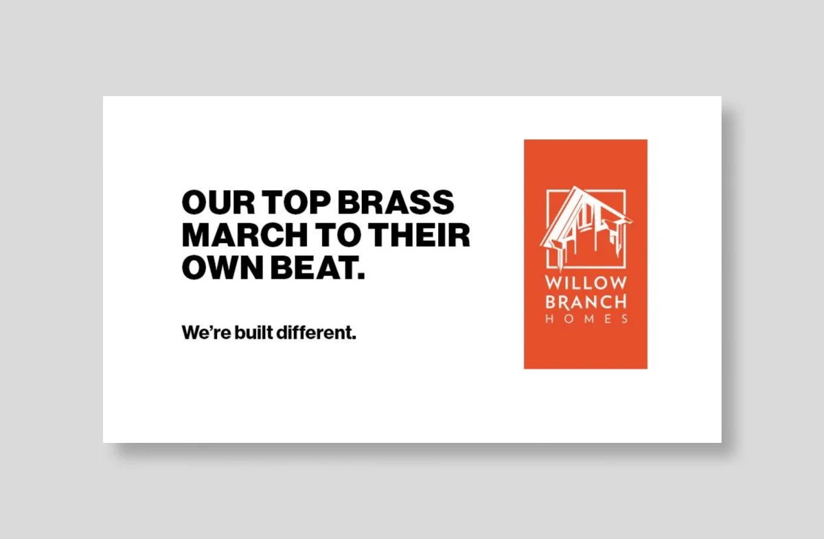 Each headline in the campaign, which spanned OOH, print, and digital, was based on 1:1 interviews with core teammates to drive home the point that Willow Branch was literally made of different (read: more trustworthy) stuff than larger, impersonal builders. The campaign endline became their brand tagline.