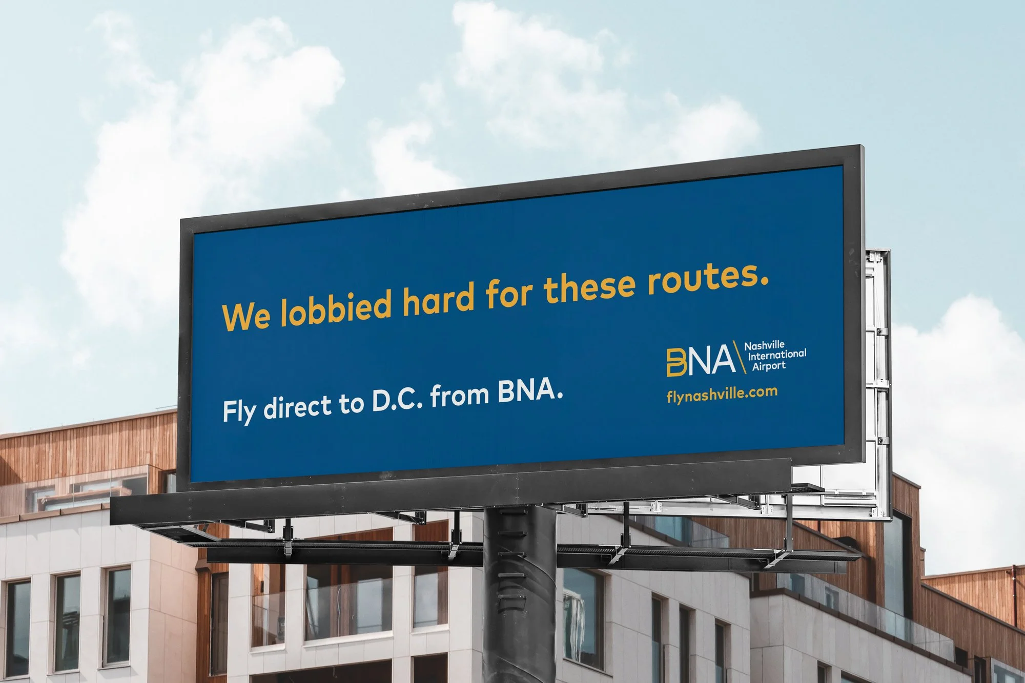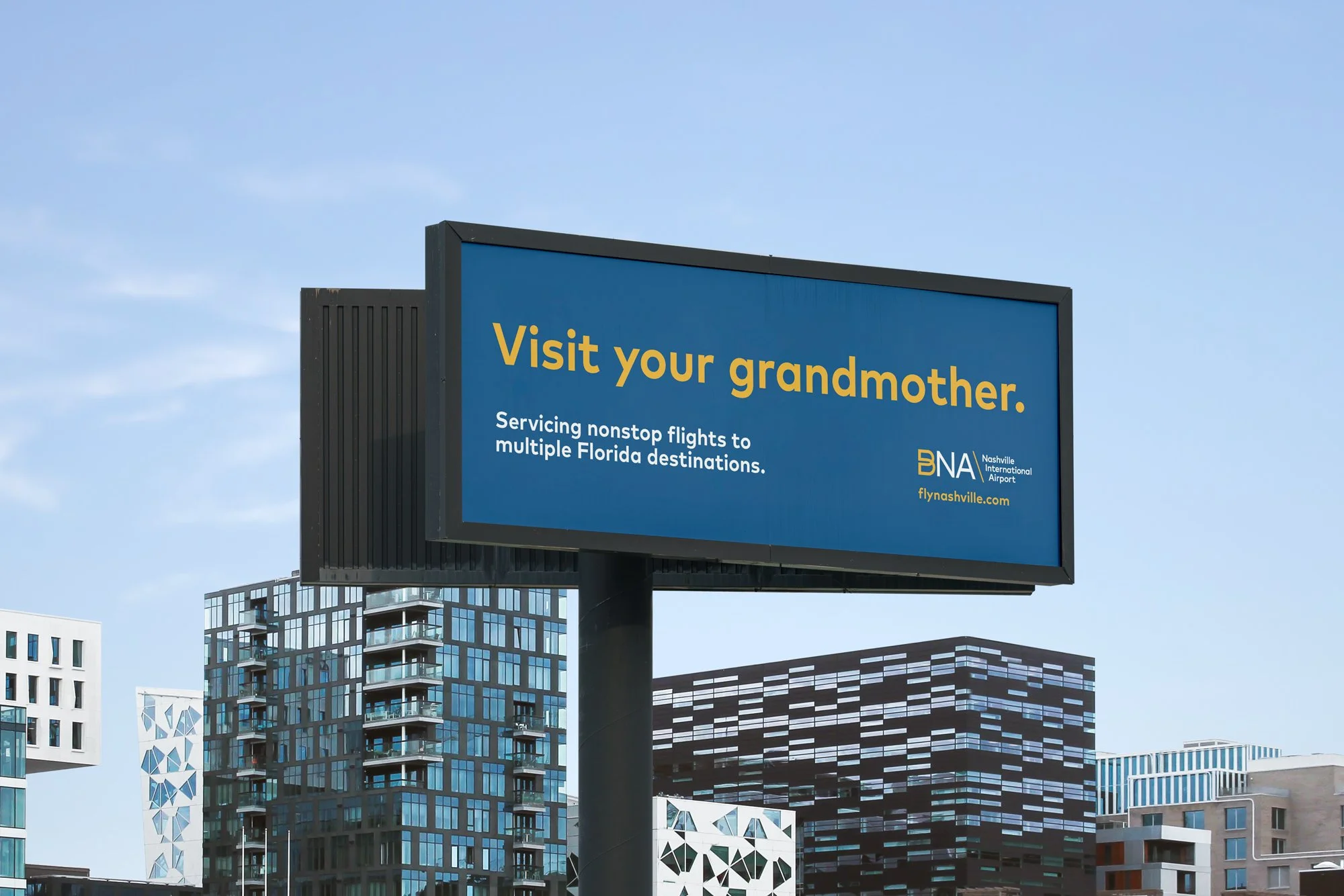 Non-stop flights to Florida for spring break. To London during Christmas. To just about anywhere with a functioning hangar and a Starbucks. Nashville’s international airport (aka BNA) was growing rapidly and wanted to emphasize its easy access to cities near and far. So we did just that in a year's long campaign that dotted the Nashville skyline and gave the brand a distinctive voice that carries on to this day.