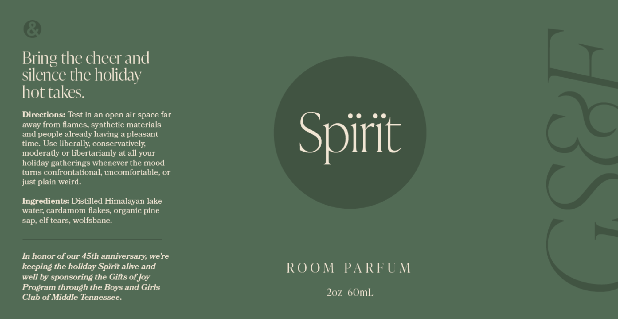 What if there was an easy way to disappear inevitable awkward holiday conversations? Enter Spïrït, the holiday-scented room parfüm, ideal for harried holiday høsts.